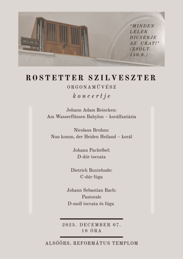 Új orgonánk első koncertjére hívjuk sok szeretettel mindazokat, akik részesei, mert adományaikkal hozzájárultak, vagy mert együtt szeretnének örülni velünk, hogy 25 év után ismét orgonaszóval dícsérhetjük az Urat. Az orgonát december 7-én, 18 órától Rostetter Szilveszter orgonaművész fogja megszólaltatni.